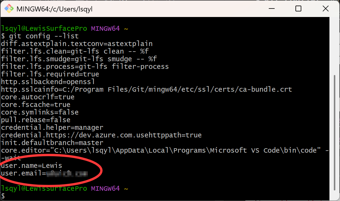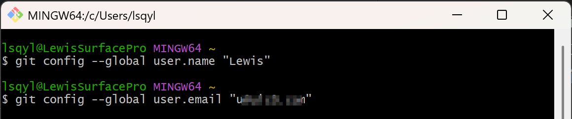 git config --global user.email "你的邮箱地址"运行命令效果如下图: